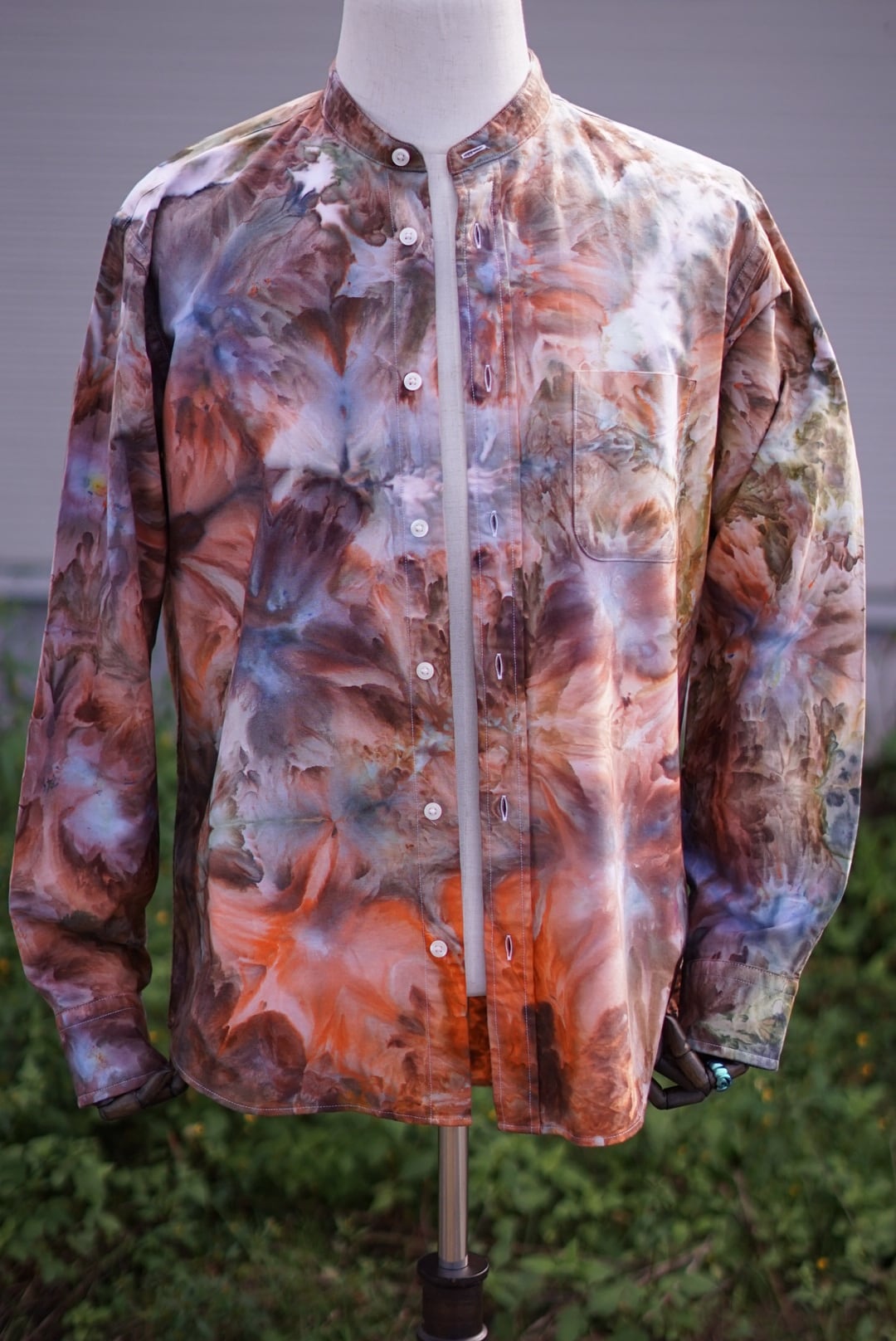 タイダイ染め襟なしシャツ 長袖 - Lサイズ【オーロラ模様】